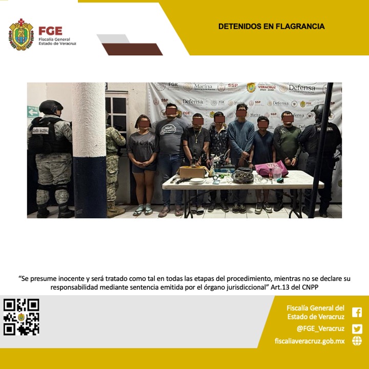 La Fiscalía General del Estado informa que, Fiscales, Peritos y Policías Ministeriales adscritos a la Fiscalía Regional Coatzacoalcos, en coordinación con la Secretaría de la Defensa Nacional, Secretaría de Marina, Guardia Nacional y la Secretaría de Seguridad Pública Estatal, detuvieron en flagrancia a Emanuel N”, Pedro “N”, Ángel “N”, Omar “N”, Adolfo “N”, Andrick Uriel “N”, Yohana “N” y un adolescente menor de edad de identidad resguardada, como probables responsables del delito contra la salud.