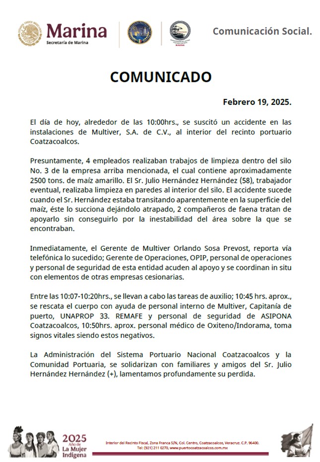 La víctima de este fatal accidente era trabajador de la empresa Multiver, concesionaria de la Administración del Sistema Portuario Nacional (ASIPONA) de Coatzacoalcos y se encontraba trabajando en un silo de maíz cuando cayó al fondo, siendo sepultado por los granos en el tanque de almacenamiento.