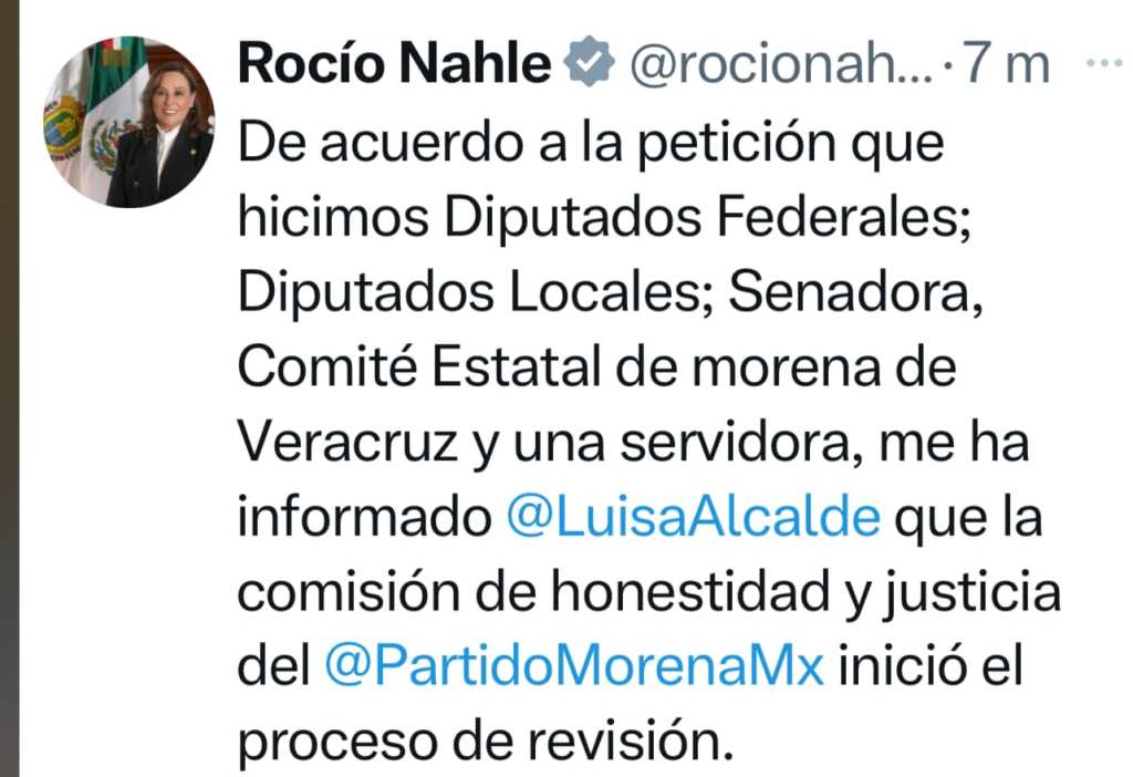 La presidenta nacional de Morena, Luisa María Alcalde Luján, informó que la Comisión Nacional de Honestidad y Justicia del partido ha iniciado un proceso de revisión respecto a la solicitud de afiliación del senador Miguel Ángel Yunes Márquez, atendiendo a la petición formal presentada por un grupo de legisladores y el Comité Estatal de Morena en Veracruz, escribió en sus redes sociales, Rocío Nahle, gobernadora de Veracruz.