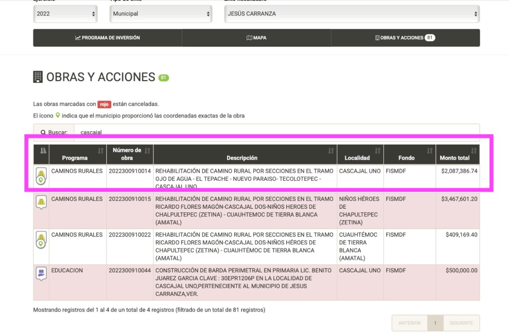 La obra aparece como concluida y pagada, lo que el ORFIS sin duda debe sancionar y darle parte a la Fiscalía General del Estado para que se investigue no solo esta, sino muchas obras más que deben estar en el mismo estado ya que el municipio de Jesús Carranza reporta ante el ORFIS una inversión de 106 millones de pesos en caminos rurales, pero la todos los caminos y brechas de ese municipio están destrozados.