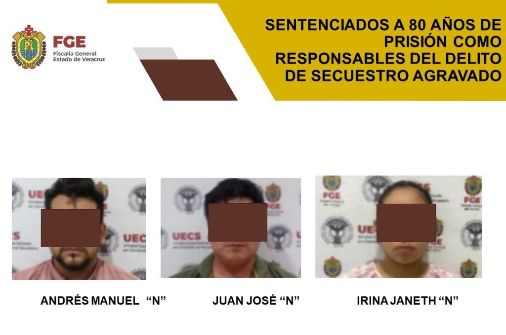 La Fiscalía General del Estado (FGE), a través de la Unidad Especializada en Combate al Secuestro (UECS) con sede en Coatzacoalcos, obtuvo una sentencia condenatoria de 80 años de prisión en contra de Irina Janeth «N», Juan José «N» y Andrés Manuel «N», secuestradores que operaban en el municipio de Nanchital.