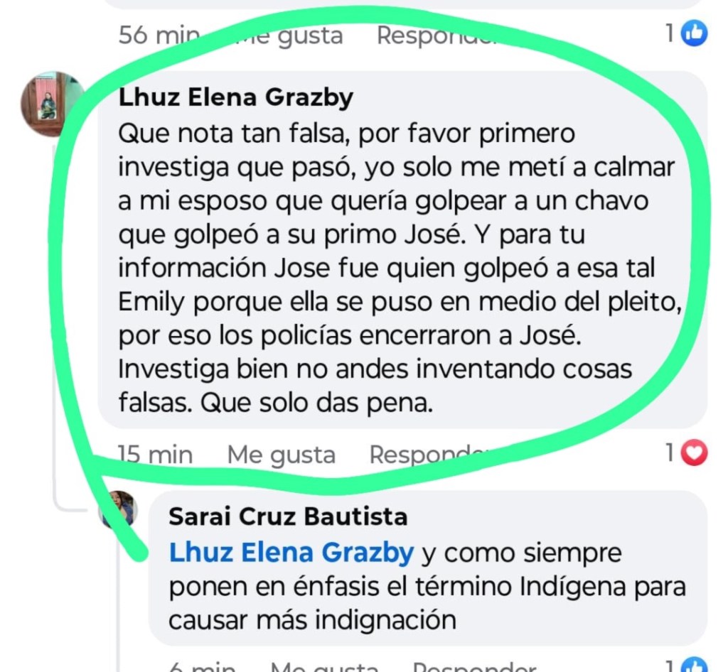 “Es una nota amarillista creada para desacreditar a mi familia”, “soy mujer y estoy en contra de la violencia hacia las mujeres, si tiene pruebas, que las muestre ante la Fiscalía y tengo la disposición de ir y aclarar, enfrentar lo que se tenga que enfrentar. No tengo nada que temer, estoy con la frente en alto, en ningún momento la he agredido, está siendo manipulada por su equipo político para desacreditar a mi familia”.