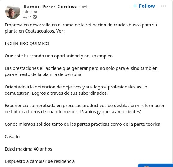 En las redes sociales de Ramón Pérez Córdova, en linkedin, el presunto dueño de la Refinería clandestina emitió una convocatoria para reclutar personal especializado, ingenieros químicos, para la operación de la planta ilegal en Coatzacoalcos.