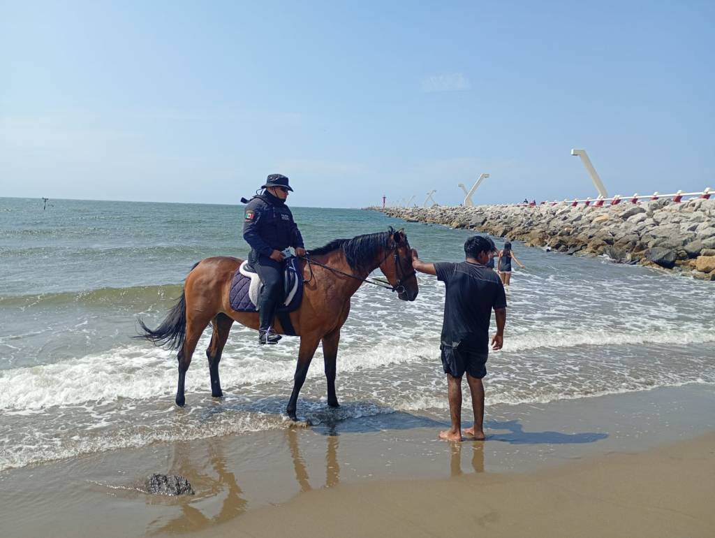 Durante esta temporada vacacional, tres binomios equinos de las Fuerzas de Seguridad Pública Estatal del Gobierno de Veracruz patrullan activamente las playas del litoral del Golfo de México en territorio veracruzano, brindando seguridad y confianza tanto a bañistas como a turistas nacionales.