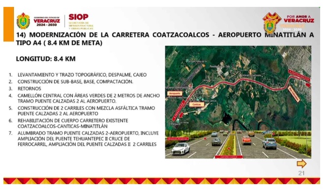 Dentro del plan estatal de infraestructura carretera para el presente ejercicio fiscal, el cual contempla una inversión superior a los 2 mil 537 millones de pesos, el secretario de Infraestructura y Obras Públicas (SIOP), Leonardo Cornejo Serrano, anunció la ampliación de la carretera Coatzacoalcos–Aeropuerto de Minatitlán.