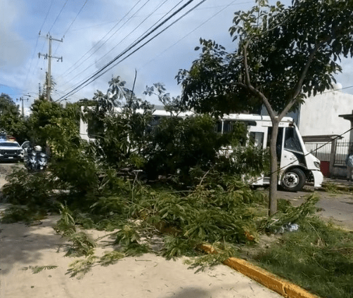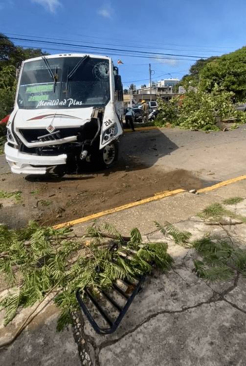 El conductor, identificado como José Fernando Ramírez, perdió el control de la unidad, que avanzó unos 15 a 20 metros y se subió al camellón, derribando dos árboles de raíz antes de detenerse en el carril contrario con daños significativos en la parte frontal.