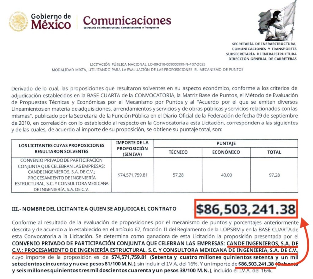 Ahora, esta empresa de Bernardo Gómez, CANDE Ingenieros, ganó el contrato para elaborar los estudios de campo y el proyecto constructivo del puente Coatzacoalcos III, con un monto de 86.5 millones de pesos.