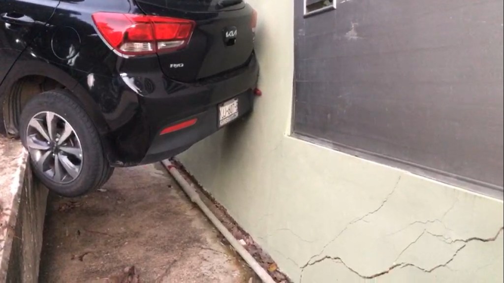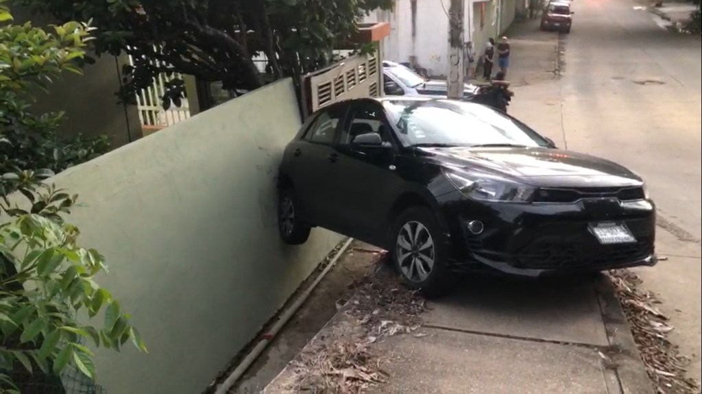 En esta ocasión, la conductora de la camioneta relató que el vehículo se le apagó, yéndose de reversa y quedando suspendido entre la banqueta y la barda dañada. Afortunadamente, la mujer resultó ilesa.