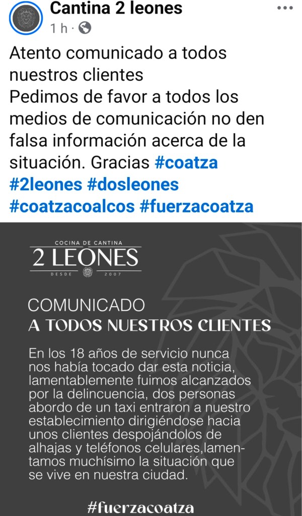 En los 18 años de servicio nunca nos había tocado dar esta noticia, lamentablemente fuimos alcanzados por la delincuencia, dos personas abordo de un taxi entraron a nuestro establecimiento dirigiéndose hacia unos clientes despojándolos de alhajas y teléfonos celulares, lamen-tamos muchísimo la situación que se vive en nuestra ciudad.#fuerzacoatza»