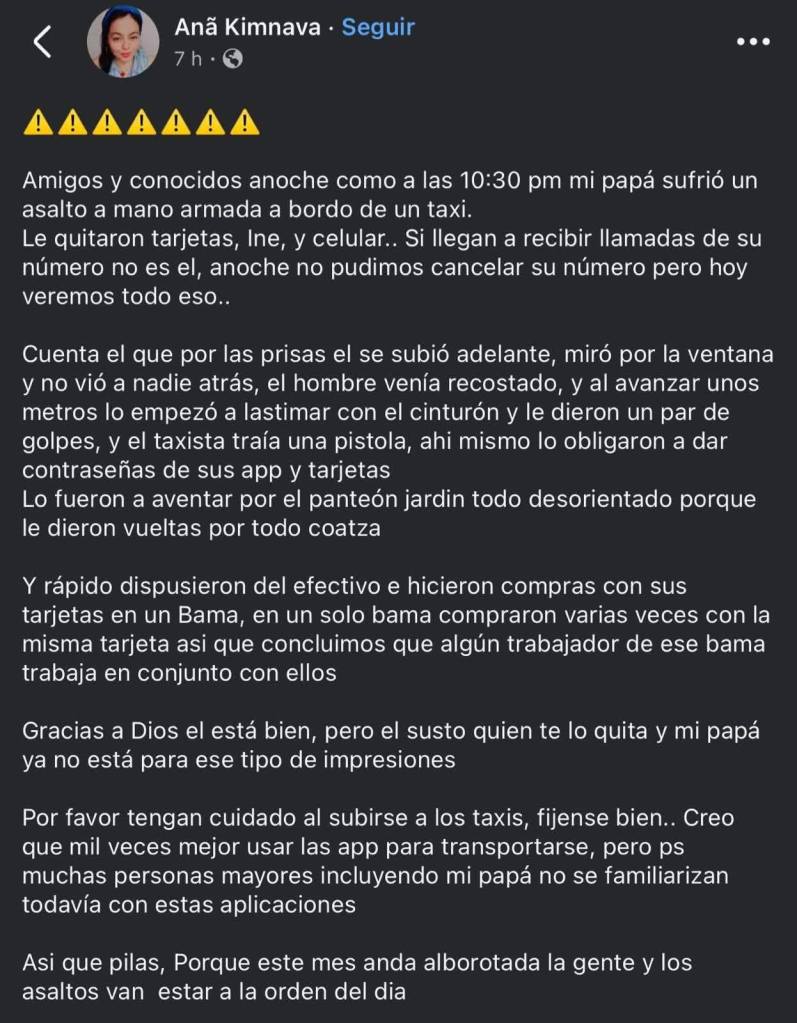 La detención de Carlos «N», estaría relacionada con hechos ocurridos a principios de este mes de diciembre, donde fue víctima una persona de la tercera edad, quién abordó el vehículo tipo Tsuru con colores oficiales de taxi, sentándose en el asiento del copiloto; en la parte trasera del taxi se encontraba un cómplice de Carlos «N» y entre los dos, sometieron a la víctima, privándolo de la libertad para robarle todo lo que llevaba de valor.