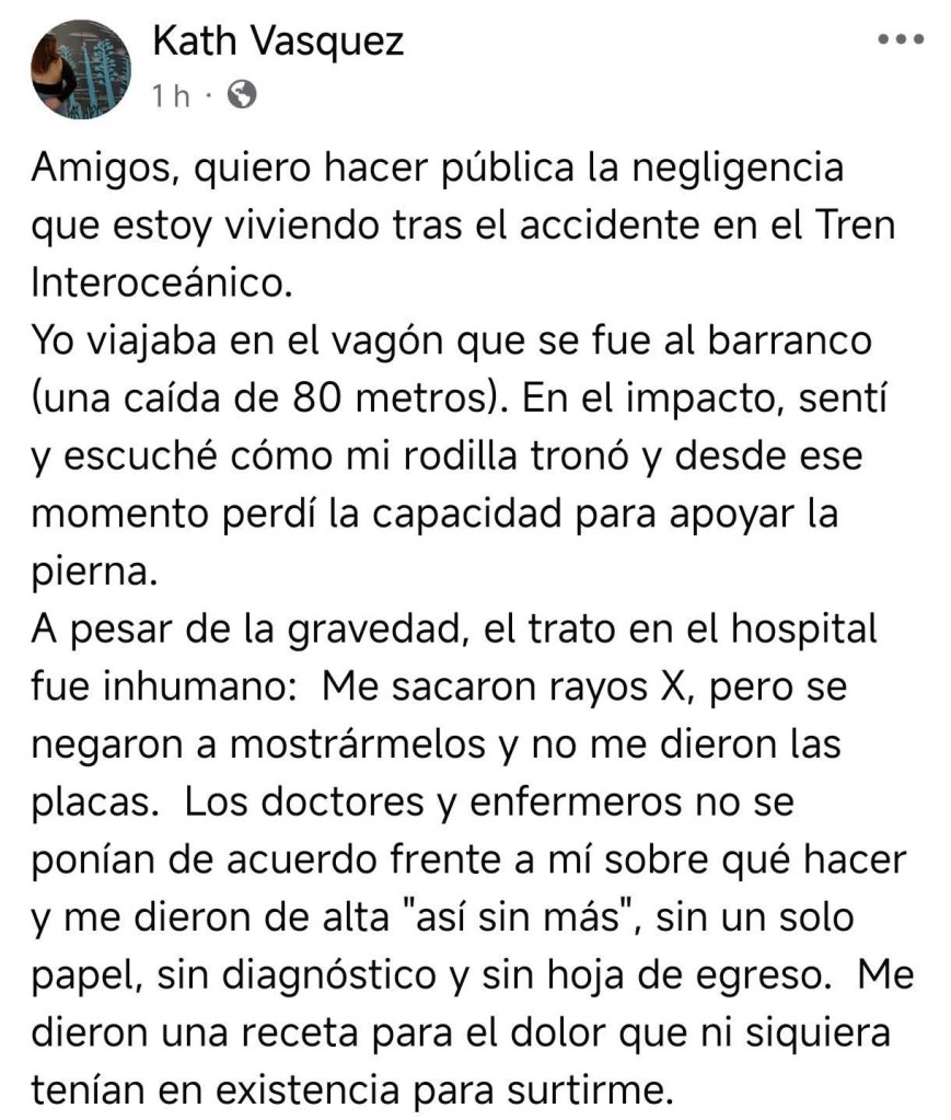 Vasquez, quien se encontraba en el vagón que se precipitó a un barranco de aproximadamente 80 metros, relató el momento exacto de su lesión: «Sentí y escuché cómo mi rodilla tronó». Sin embargo, al llegar al nosocomio, el auxilio médico fue, según sus palabras, superficial y desorganizado.