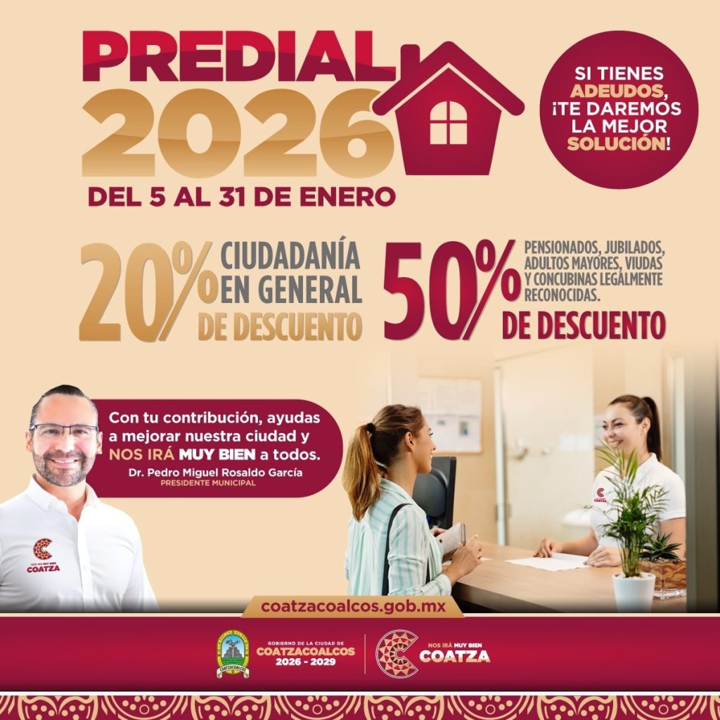 Coatzacoalcos, Ver., 4 de enero de 2026.- A partir de este lunes 5 de enero, el Gobierno de Coatzacoalcos inicia el programa de recaudación del impuesto predial correspondiente al ejercicio 2026, ofreciendo estímulos económicos para quienes realicen su pago de manera anticipada.