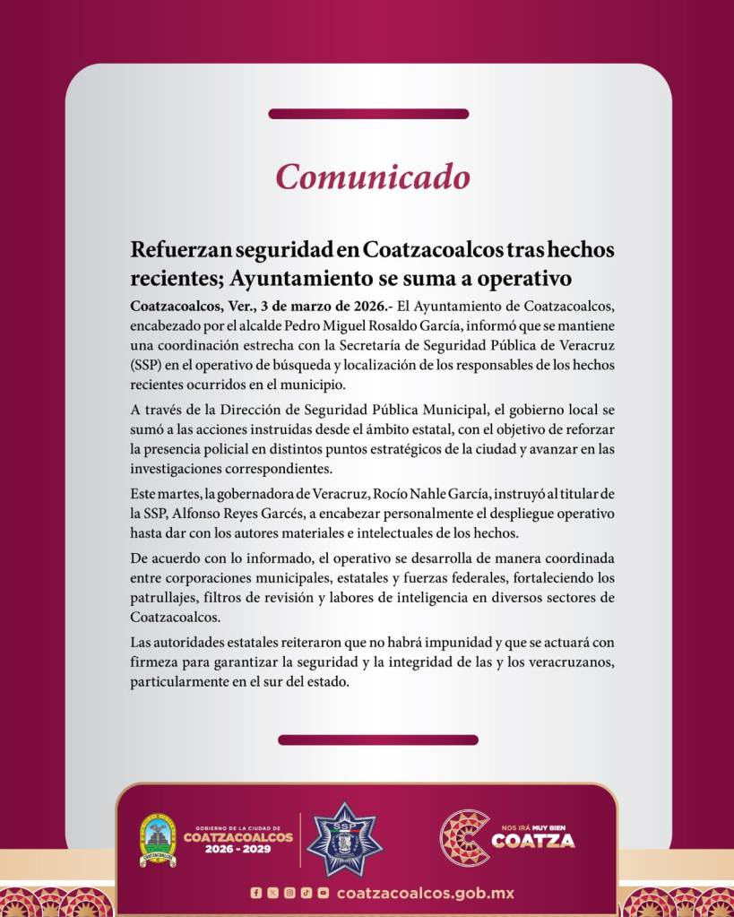 Por su parte, el Ayuntamiento de Coatzacoalcos informó que mantiene una coordinación estrecha con la SSP y fuerzas federales. A través de la Dirección de Seguridad Pública Municipal, el gobierno local se ha sumado a las acciones de patrullaje y filtros de revisión en puntos estratégicos de la ciudad.